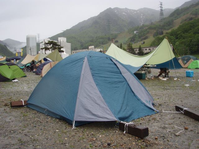 5月24日朝8時に出発、8時間もあれば余裕で着くだろう!!なんて考えてたら、甘かった^^;秋田は快晴なのに苗場は雨(>_<) Boneの今年度の雨男は完全に俺だと確信した。会場は雨と風が強く、しかもいつものごとくテントのペグは石が邪魔して刺さらない(涙)
