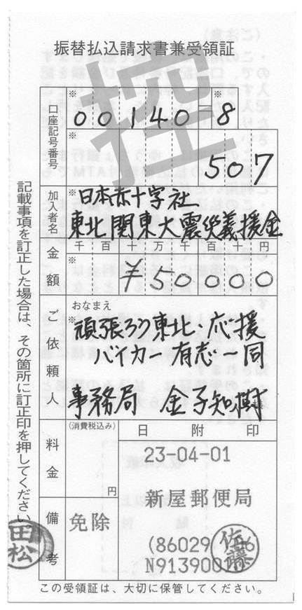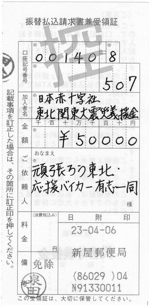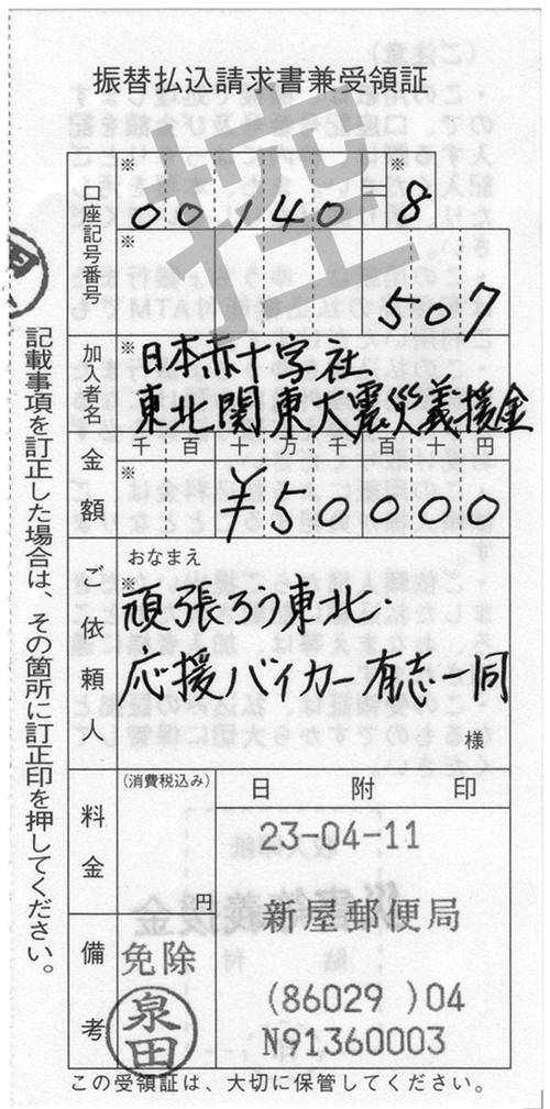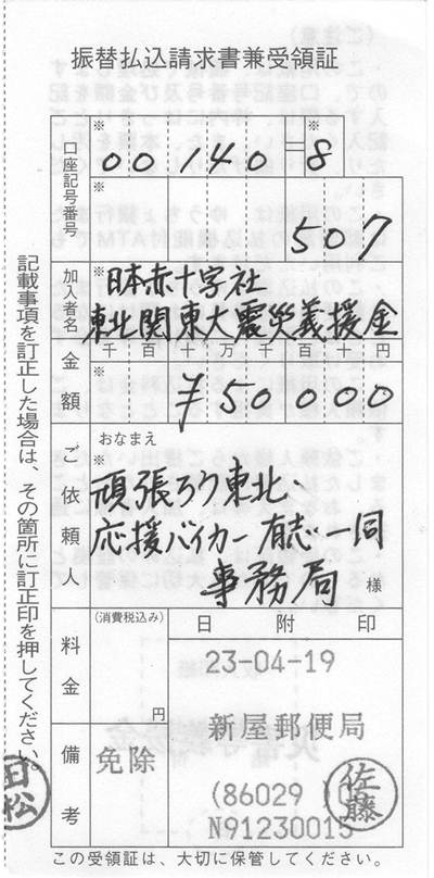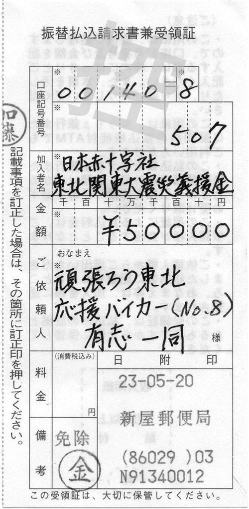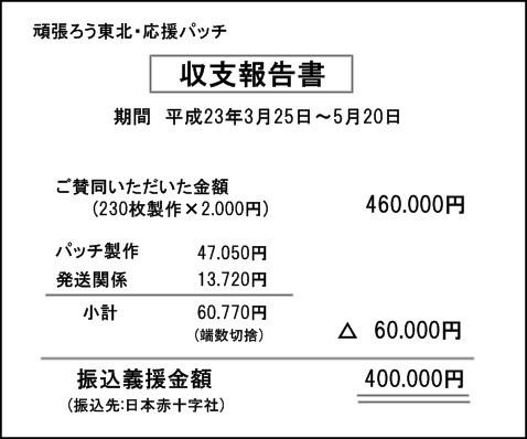 3月25日から始まった「頑張ろう東北・応援バイカー」のフロジェクトが無事終了いたしました。 当初は5万円でも10万円でも義援できれば・・・と思って始めた企画だったのですが、最終的には総パッチ数230枚、振込義援金額400.000円となりました。たくさんのバイカーの皆様にご賛同いただき心より感謝申し上げます。 皆様から熱い気持ちとコメントをいただき事務運営した私がかえって励まされました 北海道から鹿児島まで200名以上のバイカーがこのパッチに込められた想いを胸にこれから走り続けていく 同じパッチをつけたバイカーが旅先でこのパッチを見つけシェイクハンドしてくれたら嬉しいな 負けるな東北!!あの日を忘れずこれからもずっと・ずっと応援していきます。また応援プロジェクト等立ち上げた際はご協力お願いいたします。 チを製作していただいたハヤサカ刺繍様はじめ取りまとめをしていただいた方々のご協力に5月20日 応援バイカー事務局 担当 TOMO ※収支報告書を作成いたしました。 (クリックすると拡大されます)