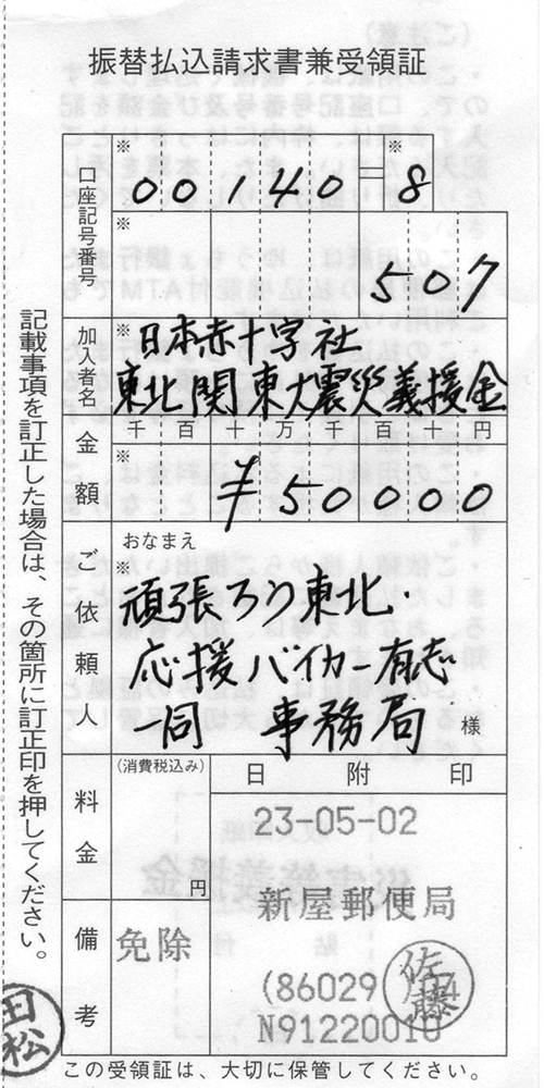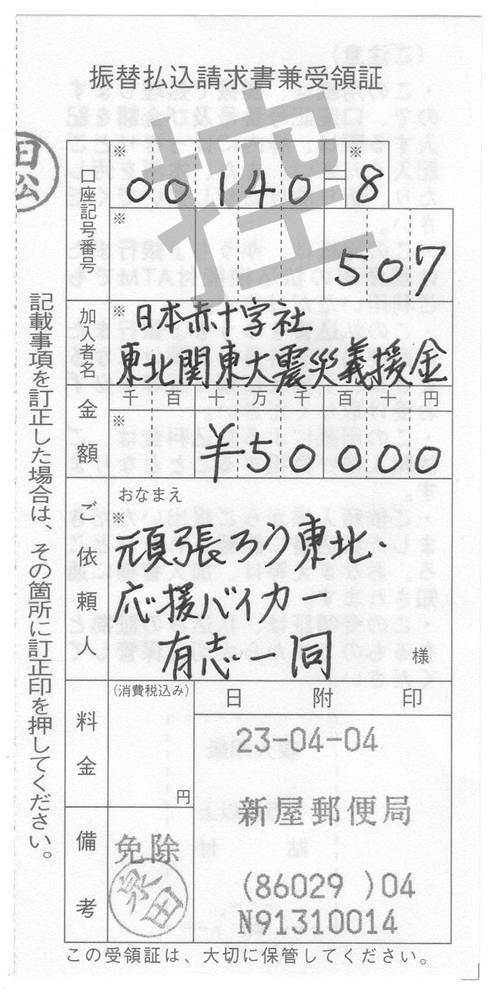 ※日本赤十字社へ振り込んだ義援金額の合計は400.000円です。